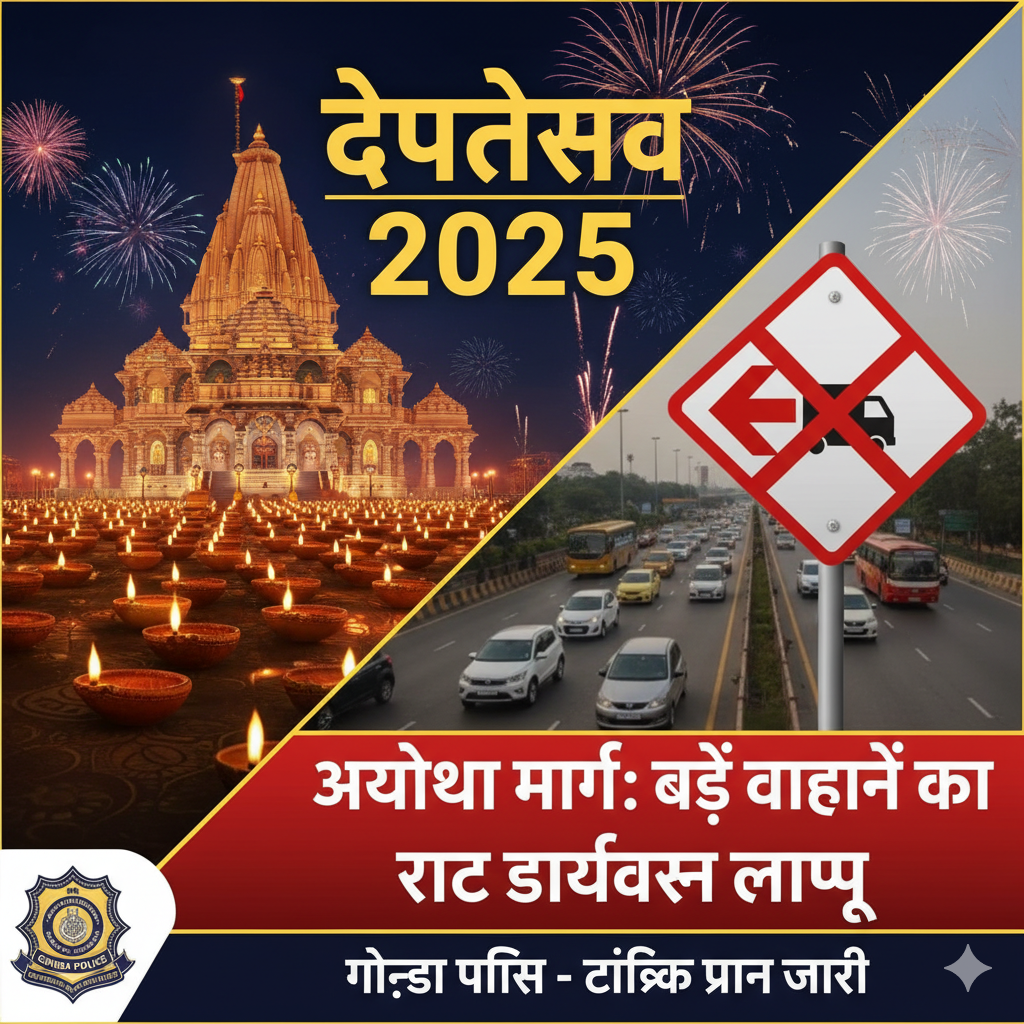 जनपद गोण्डा। आगामी दीपोत्सव कार्यक्रम को देखते हुए जनपद अयोध्या में सुरक्षा व्यवस्था और यातायात सुचारु बनाए रखने के लिए बड़े मालवाहक वाहनों के आवागमन पर विशेष ट्रैफिक प्लान लागू किया गया है। गोण्डा पुलिस प्रशासन ने दीपोत्सव 2025 के दौरान भीड़भाड़ को नियंत्रित करने और किसी प्रकार की जाम की स्थिति से बचने के उद्देश्य से गोण्डा-अयोध्या मार्ग पर अस्थायी रूट डायवर्जन घोषित किया है। यह व्यवस्था 18 अक्टूबर 2025 की रात्रि 12 बजे से प्रभावी होकर 20 अक्टूबर 2025 तक या कार्यक्रम एवं भीड़ समाप्त होने तक लागू रहेगी। इस अवधि में ट्रक, डीसीएम, ट्रैक्टर ट्रॉली आदि जैसे बड़े वाहनों को अयोध्या मार्ग से होकर गुजरने की अनुमति नहीं होगी। पुलिस प्रशासन ने स्पष्ट निर्देश जारी किए हैं कि सभी परिवहन संचालक और चालक निर्धारित वैकल्पिक मार्गों का ही उपयोग करें ताकि यातायात व्यवस्था सुचारु बनी रहे और श्रद्धालुओं को किसी प्रकार की असुविधा न हो।