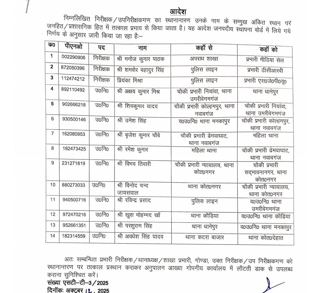 मीडिया सेल गोण्डा की ओर से जारी सूचना के अनुसार, यह फेरबदल पुलिस प्रशासन को अधिक प्रभावशाली, अनुशासित और उत्तरदायी बनाने के उद्देश्य से किया गया है।